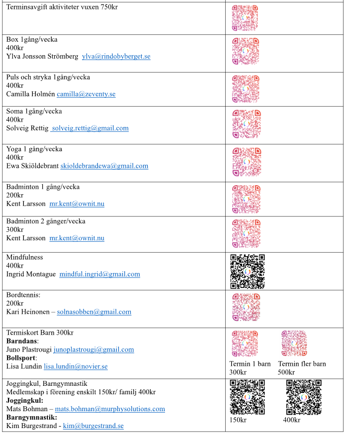 Det finns olika avgifter för aktiviteterna. Vill du bara delta i en aktivitet välja att betala bara för det. Se pris och Swish‑länk längre ner. Men om du kanske delta i flera aktiviteter eller prova på olika saker då lönar det sig att skaffa terminskortet!